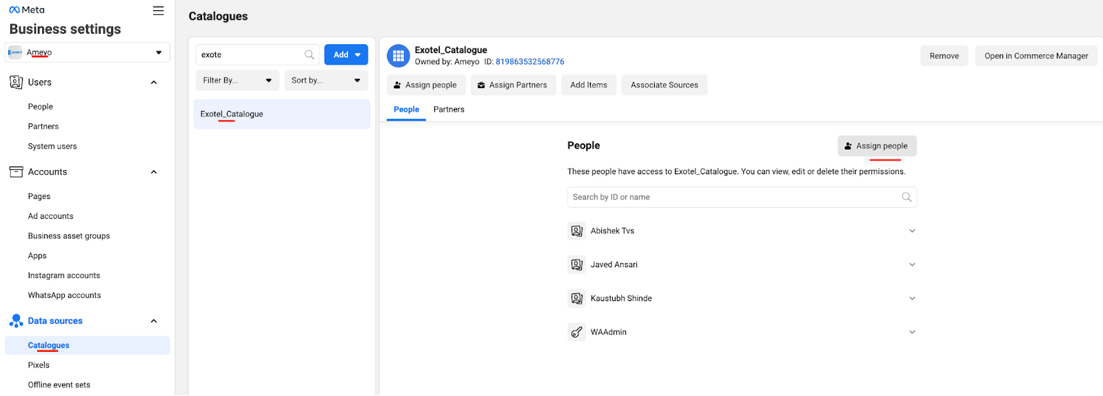 If the catalog is not created by you (seller) then reach out to your respective account manager or raise a ticket to our support on hello@exotel.in to get full access to the catalog by providing the catalog name & ID.