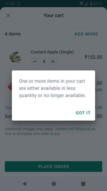 If there has been a state change on any of the items, we display a dialog saying "One or more items in your cart have been updated" — See Product Updates for more information.