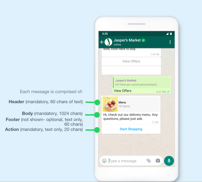 Multi-Product Template Messages: Template messages containing information about up to 30 products from your e-commerce catalog, organized in up to 10 sections, in a single message. (to be supported soon)