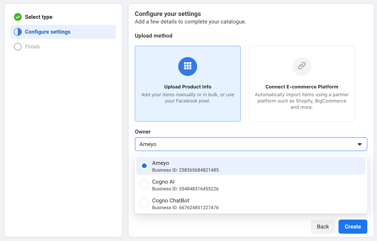 Select the first option Business ID and paste this Ameyo BSP Business ID: 258365684821485.