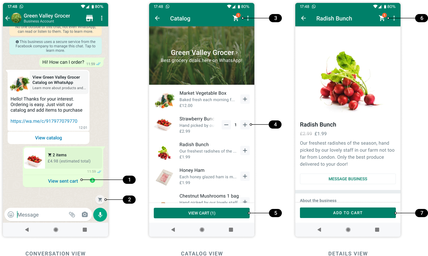 Enable Cart: When enabled, cart-related buttons appear in the conversation, catalog, and product details views: