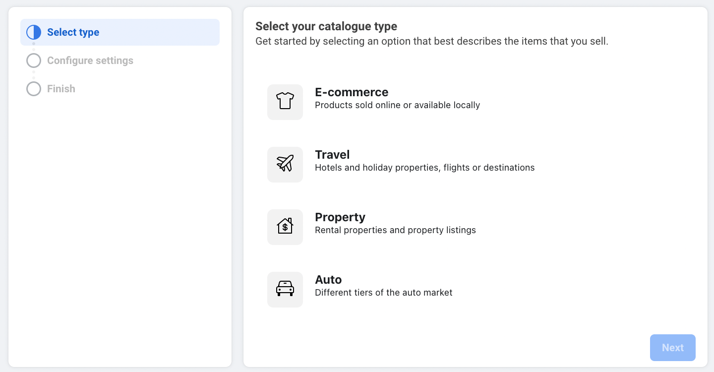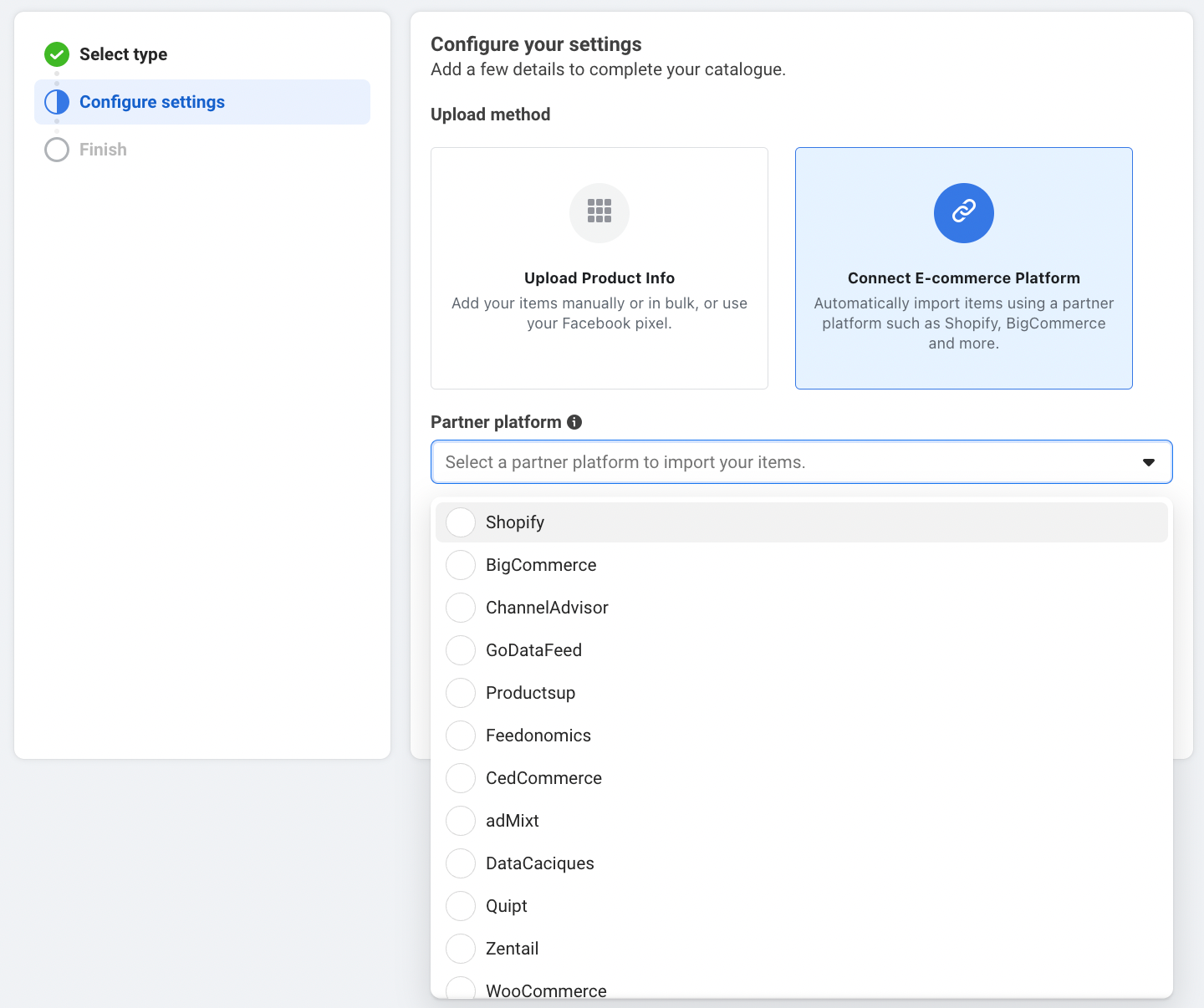 Partner platform: If you already host your items on a partner platform that has an integration with Meta, you can import items to your catalogue in Commerce Manager. You can then continue to manage your items on your partner platform and any updates will automatically sync to Commerce Manager.