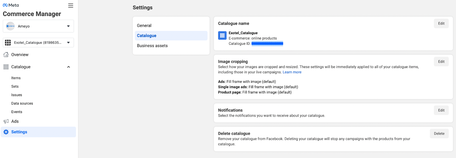 catalog_id: This is your unique ID for the catalog. You can get the Catalog ID from your Commerce Manager - https://business.facebook.com/commerce/catalogs/