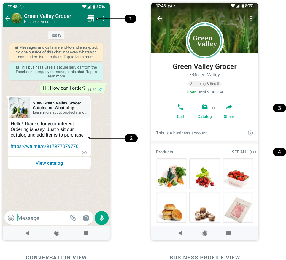 When enabled, the catalog storefront icon and catalog-related buttons appear in conversation and business profile views as shown below: