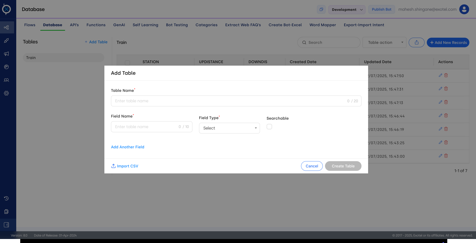This guide details how to create and manage tables within the Database module and how to connect them to your conversation flows.