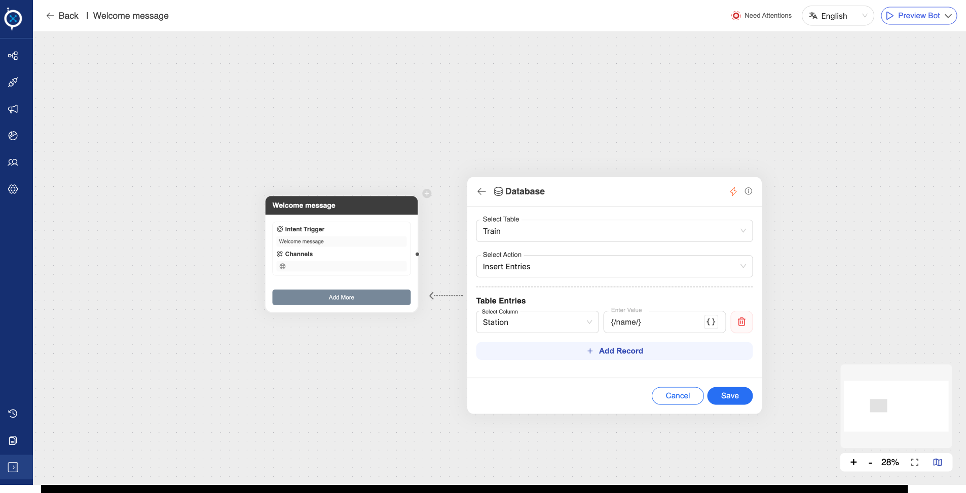 This feature is essential for building dynamic, data-driven conversational flows. Instead of losing information once a conversation ends, you can store it in a structured way. The Database is directly accessible from the Flow Builder through the "Database" action element, allowing you to perform common database operations like inserting, updating, searching for, and deleting records as part of a user journey.