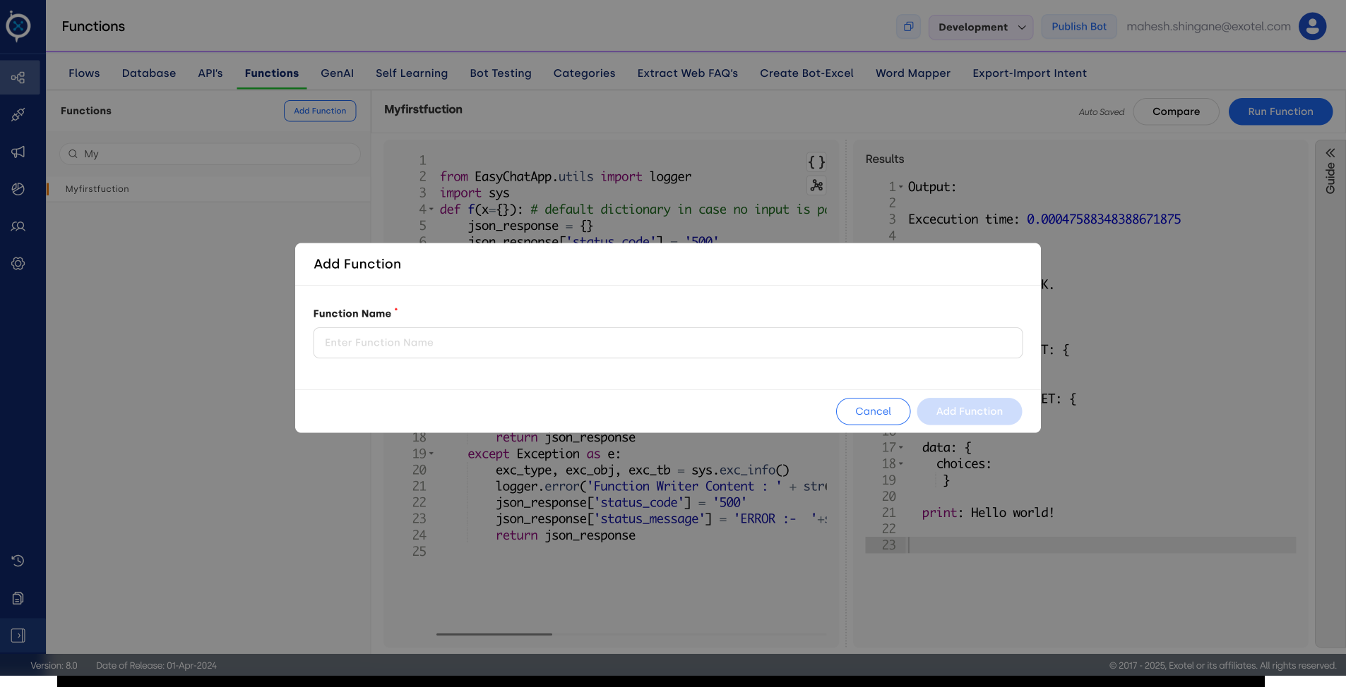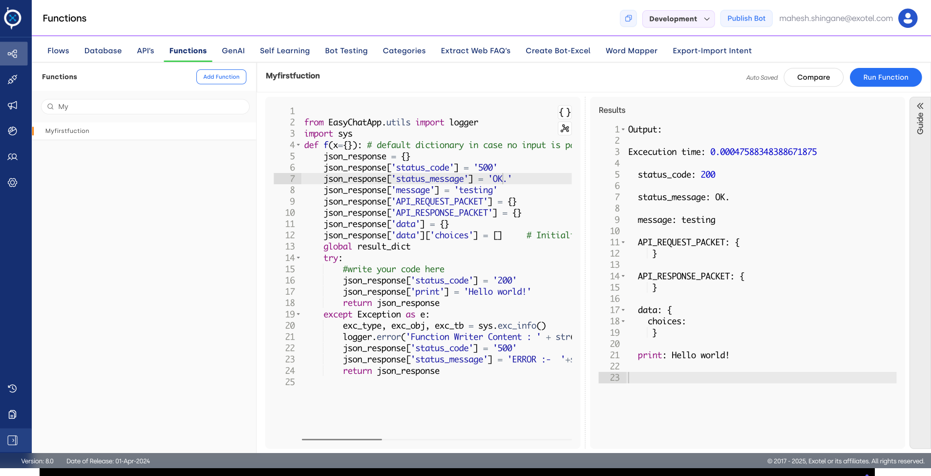 The Functions module is a powerful, pro-code feature within the Exo-Chatbot platform designed for developers and advanced users. It provides an integrated Python code editor, allowing you to write custom logic to handle complex scenarios that cannot be achieved with the standard no-code elements in the Flow Builder.