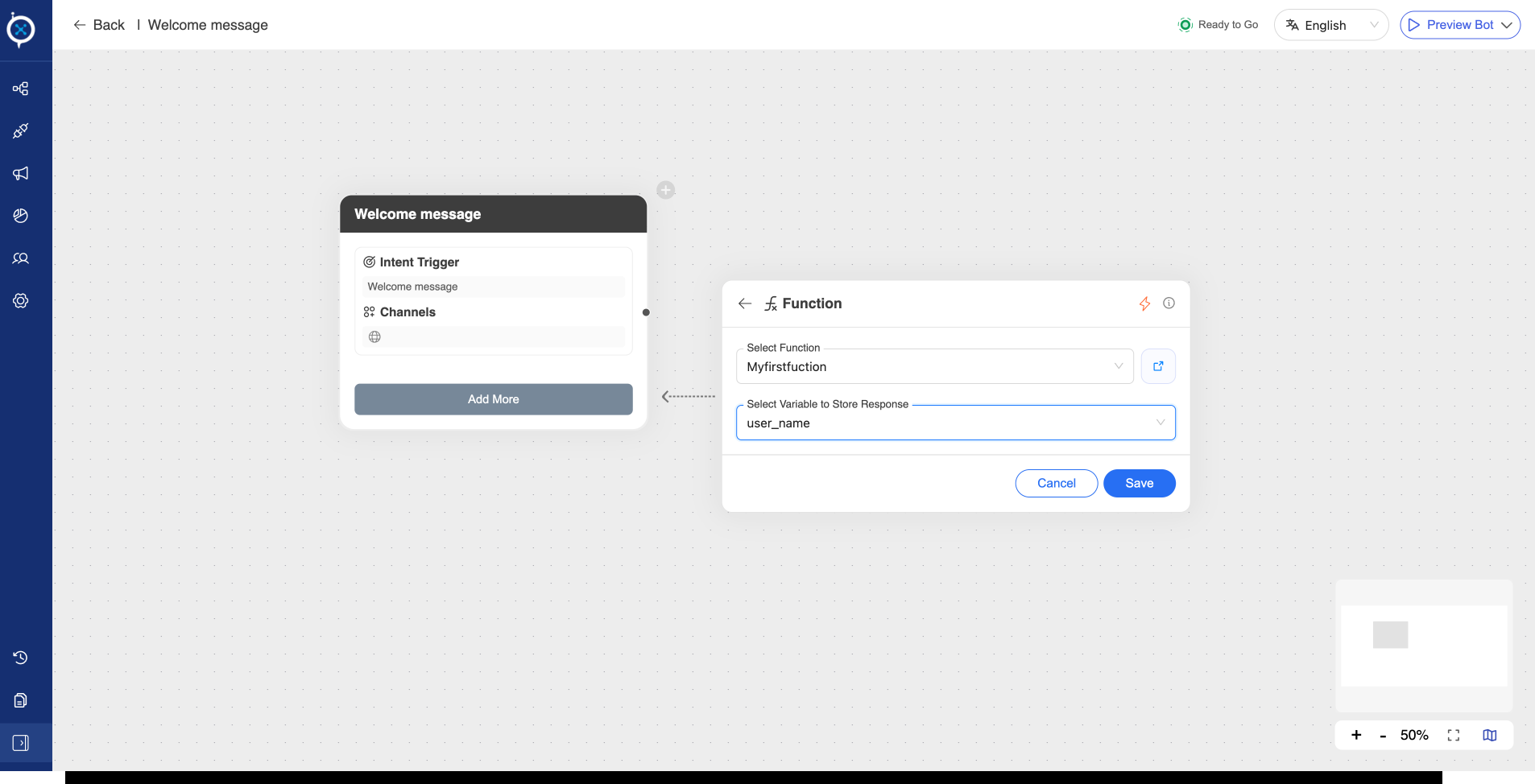 Select Variable to Store Response: Choose or create a variable where the output of your function will be saved. This is crucial for using the result in the next steps of the conversation.