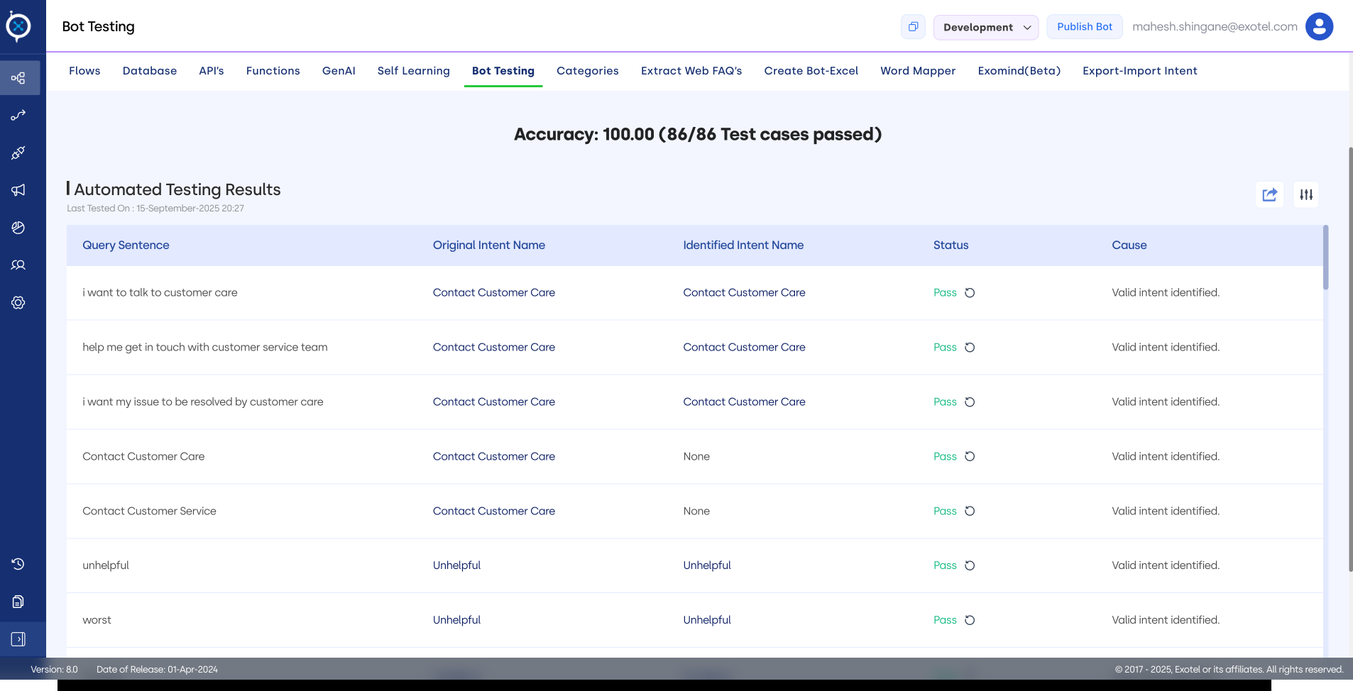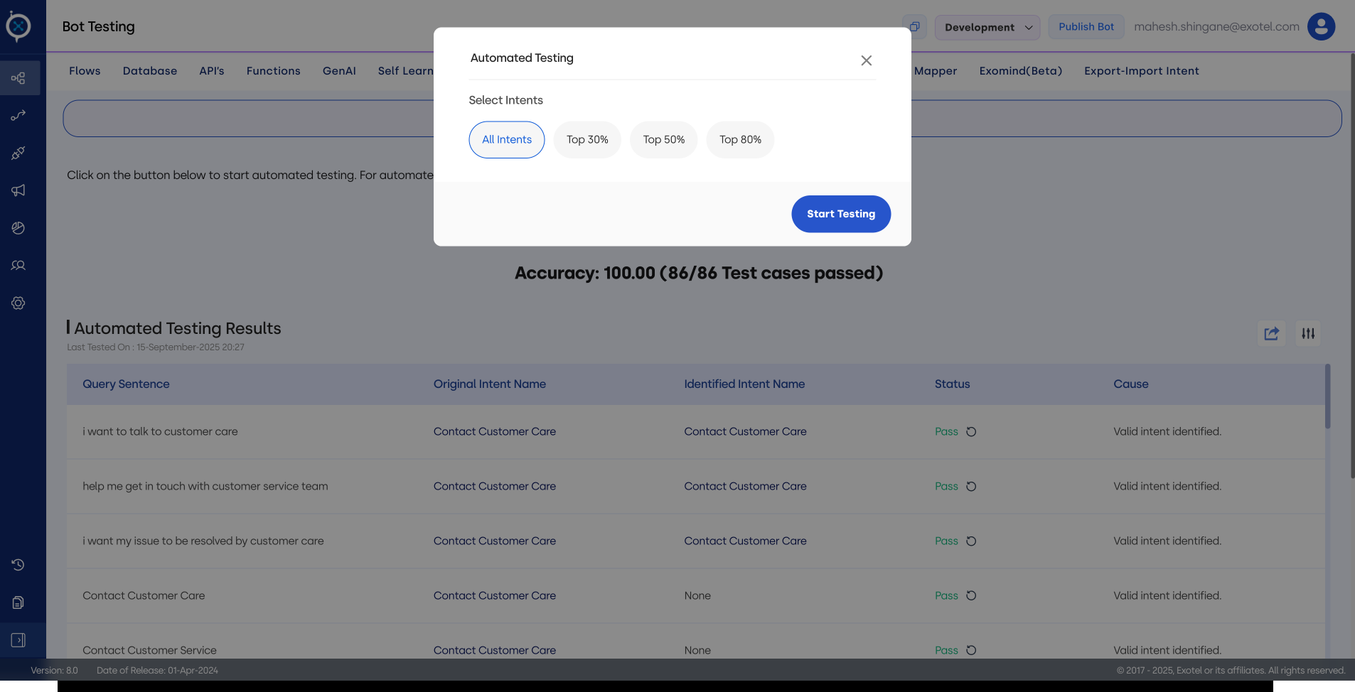 The feature provides flexibility by allowing you to test individual intents, select groups of top intents for faster checks, and filter the tests based on the last modification date. The results are presented in a clear report that can be exported via email for further analysis.