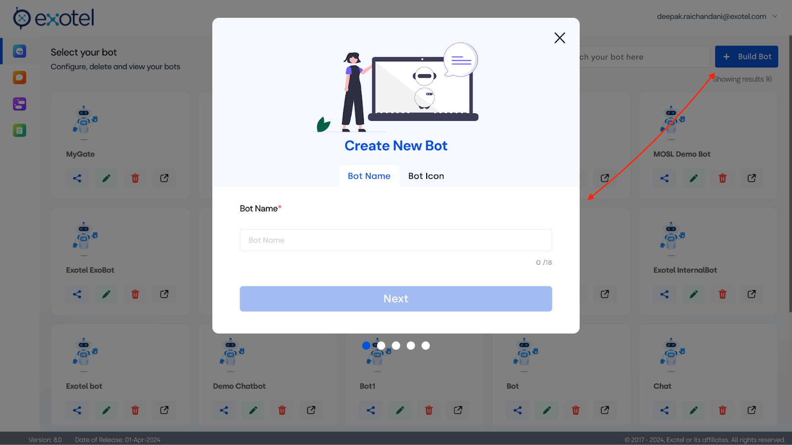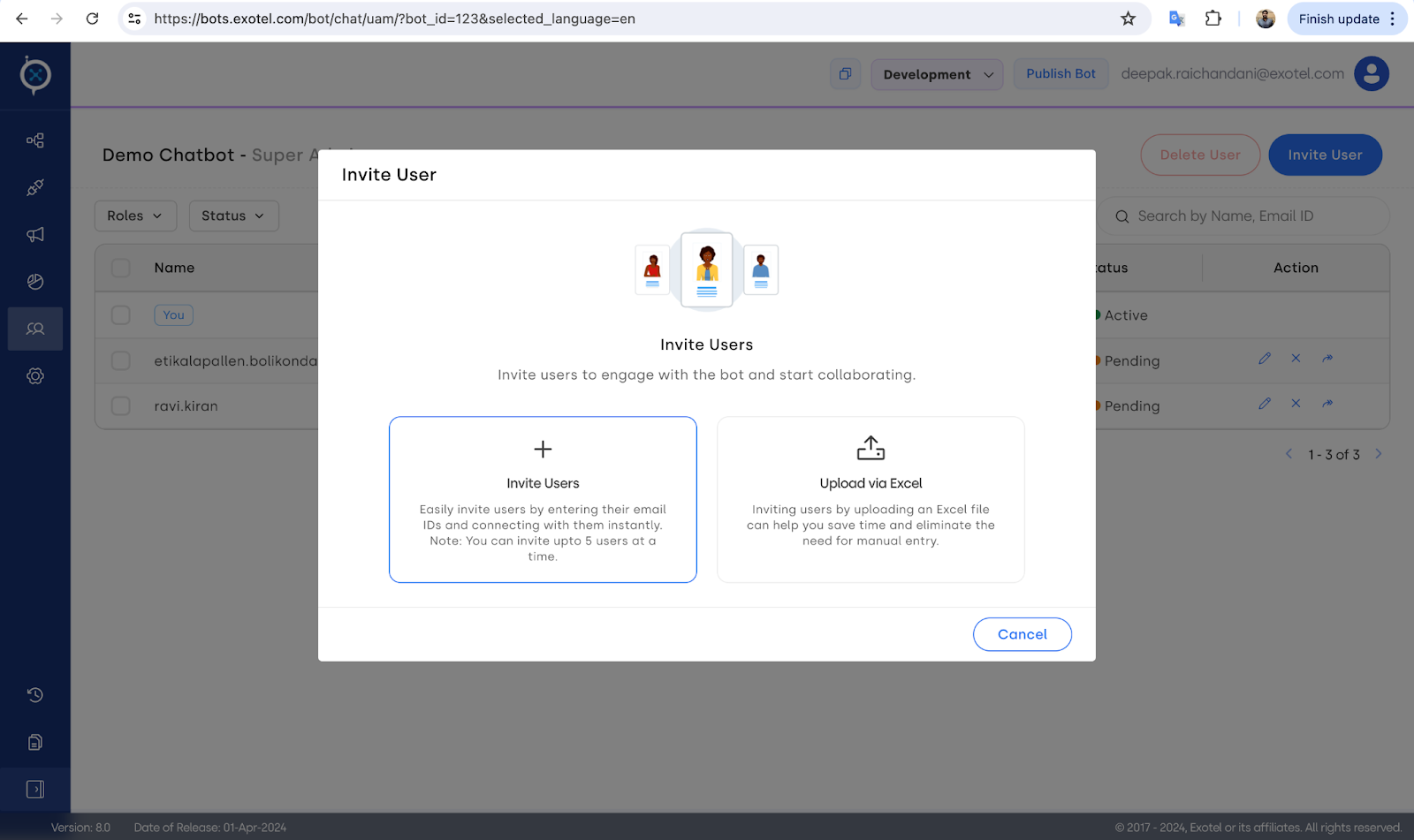 This section is for Exotel employees or users with Super Admin privileges who need to create a new chatbot and invite others to collaborate.